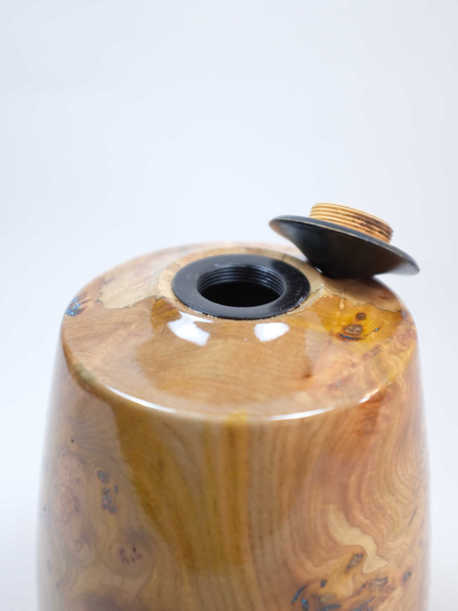 Secure Closure System: The lid is attached using a threaded plug (made of a contrasting dark material, like Ebony) that screws securely into the body, ensuring a safe and discreet closing mechanism.