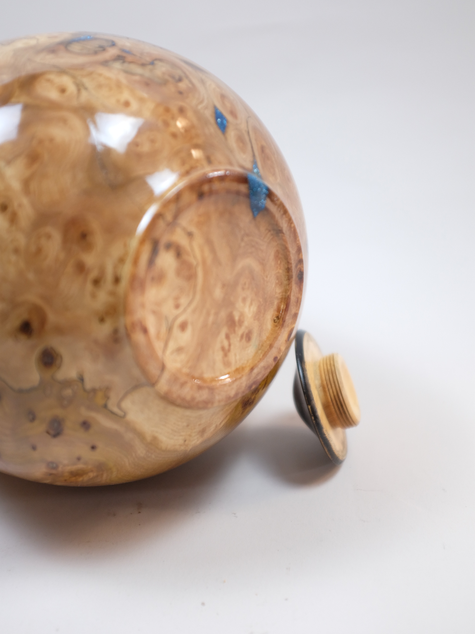 Materials: Burr Elm, Ebony wood, Holographic glitter, Natural wood finish, Hand cut threaded lid