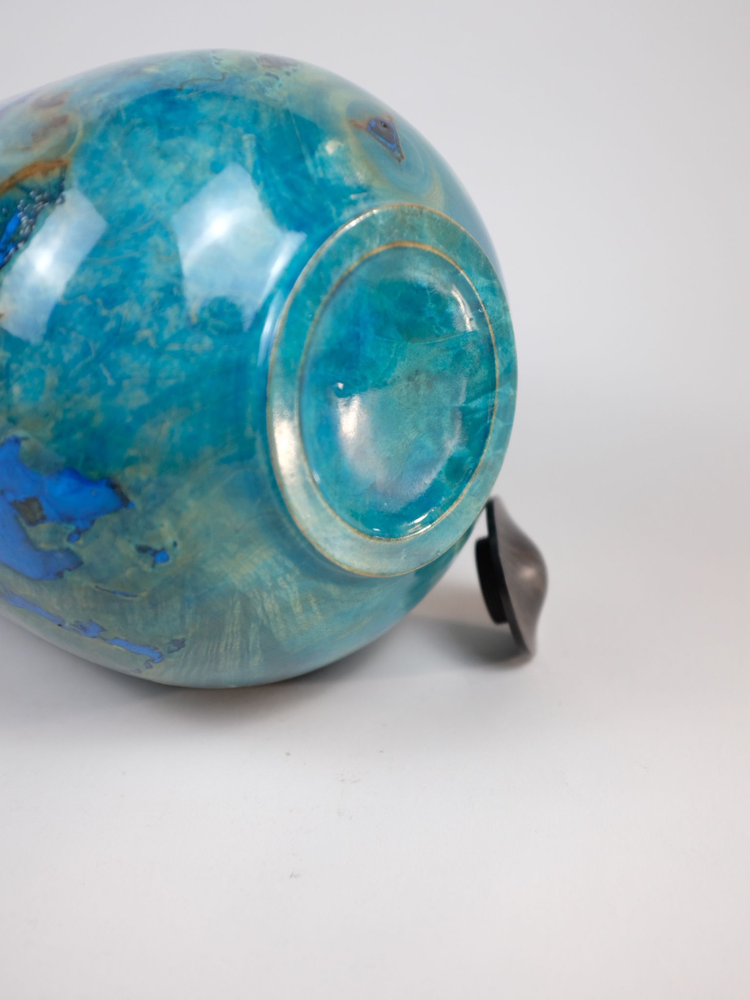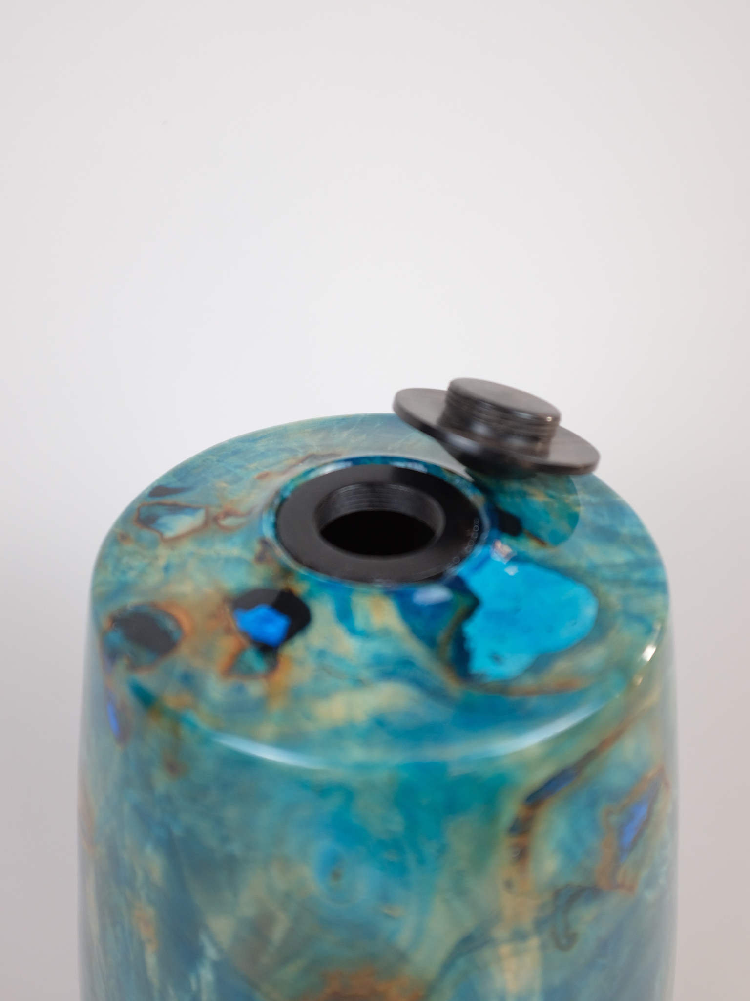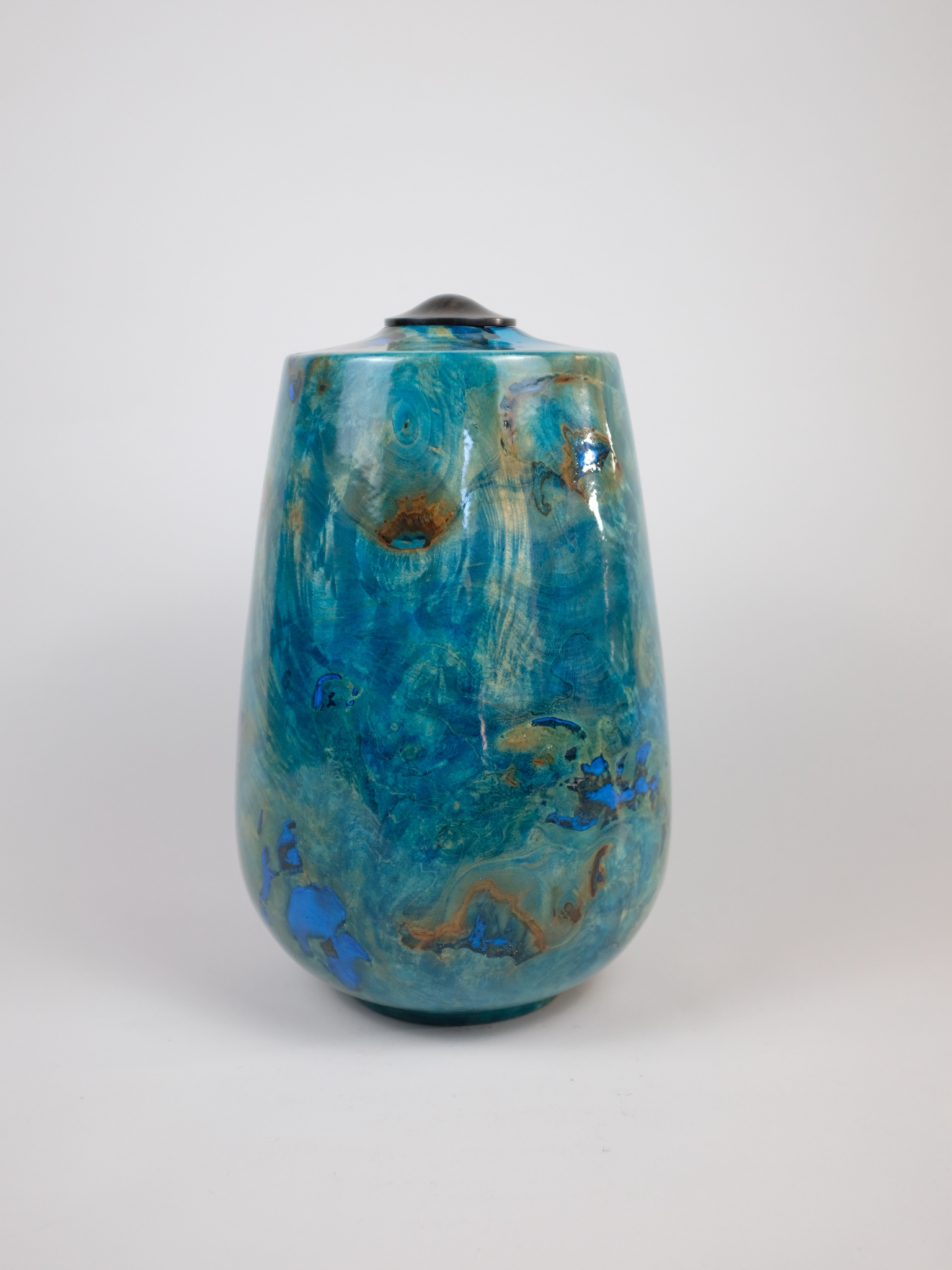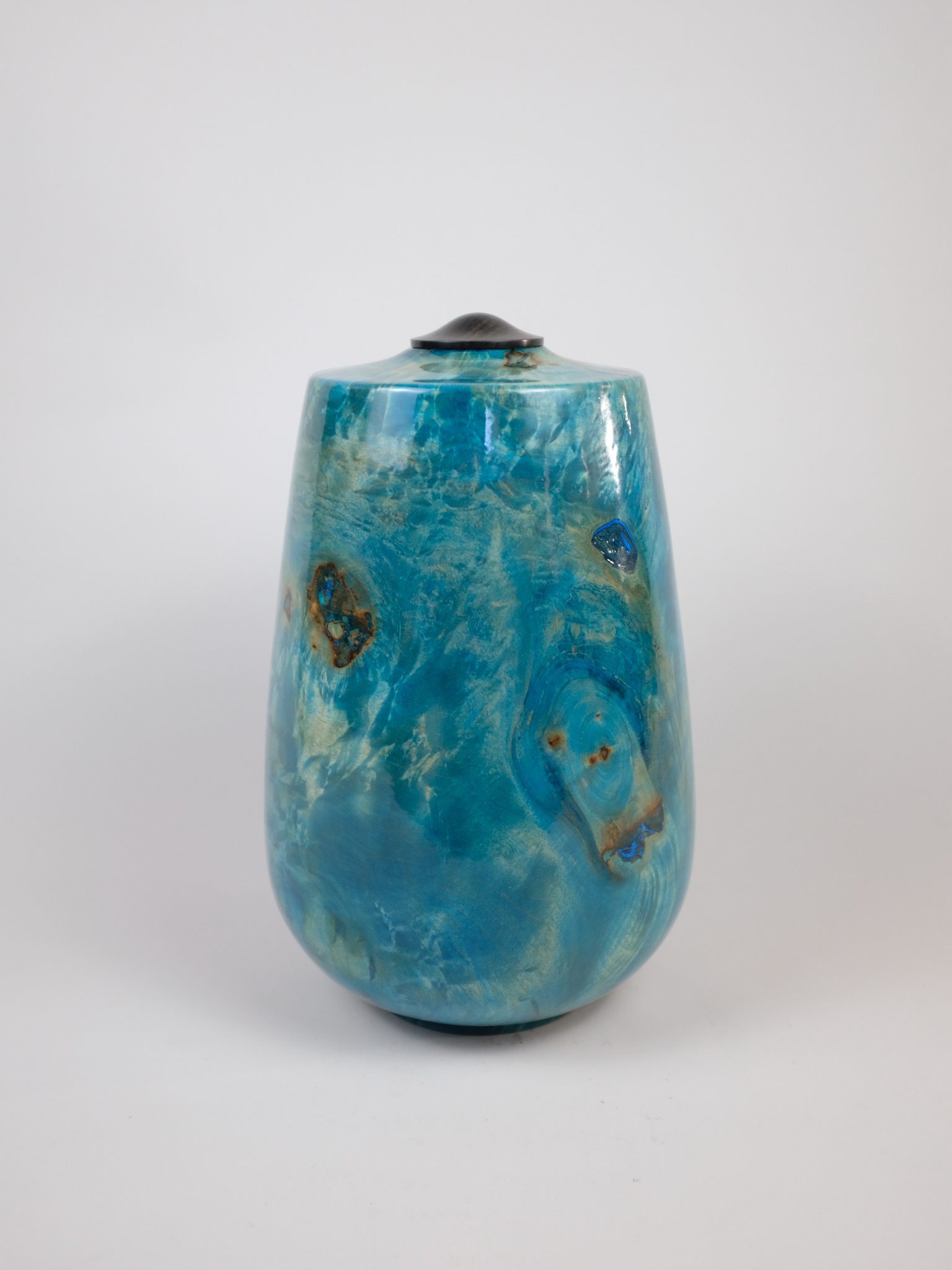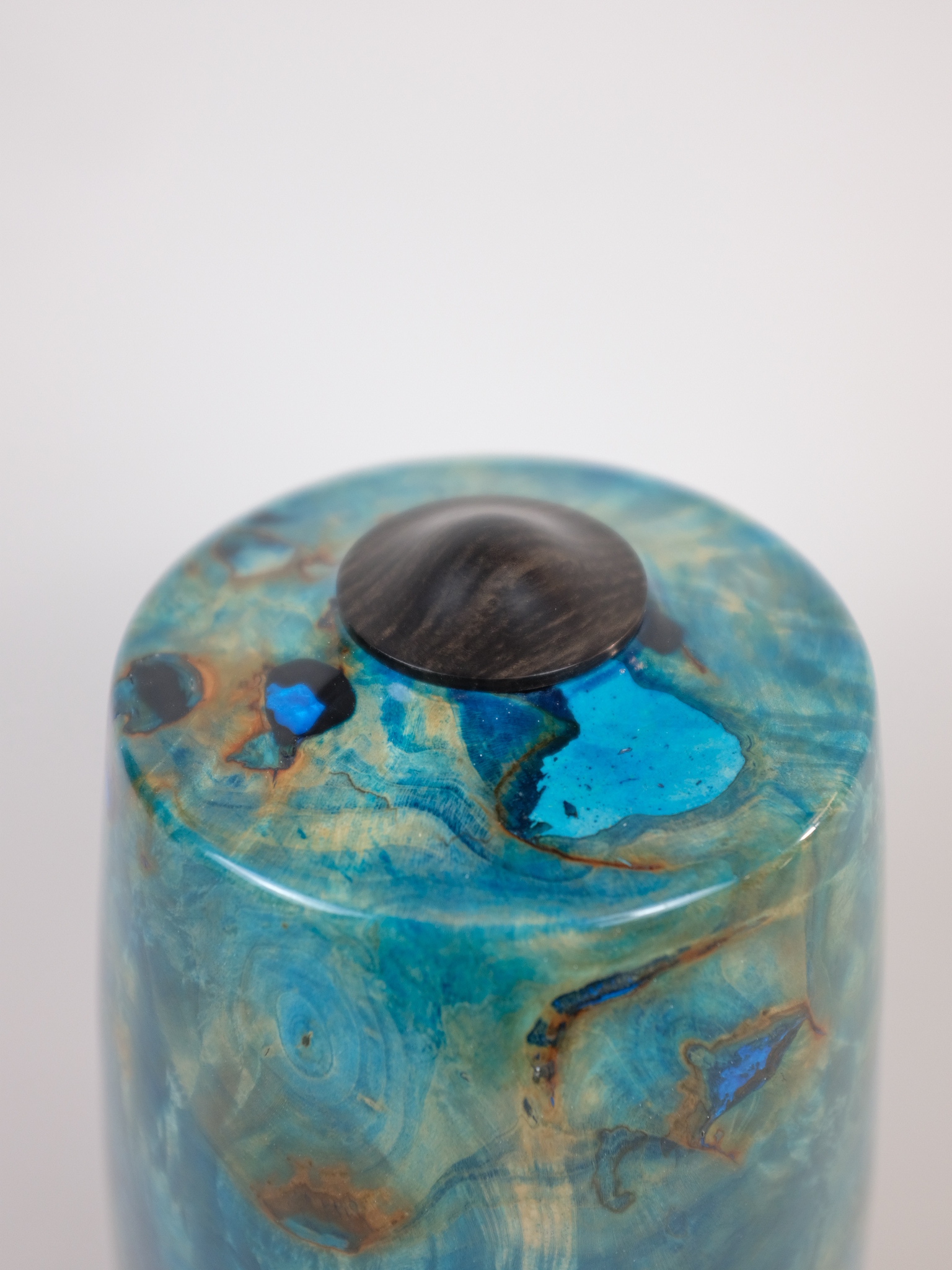 This piece of wood was carefully picked from an estate in Kent for this handmade wooden urn. This particular piece was turned and hollowed, then six coats of natural blue stain has been applied in between the sanding stages creating a multi-layered alluring effect.