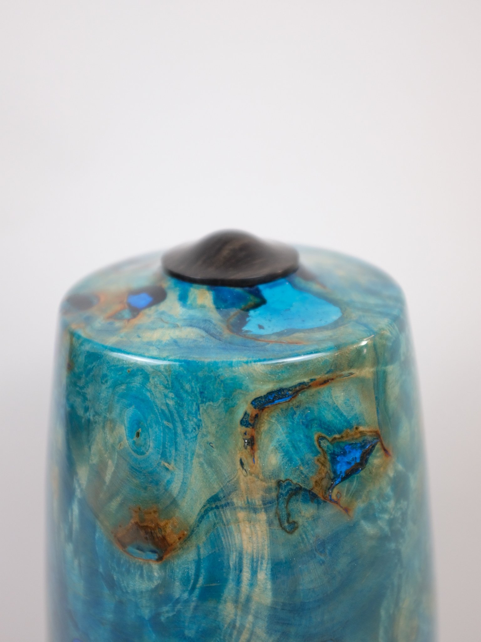 Materials: Wood: Rippled Sycamore, Ebony, Stain: blue stain, Natural wood finish, Hand cut threaded lid