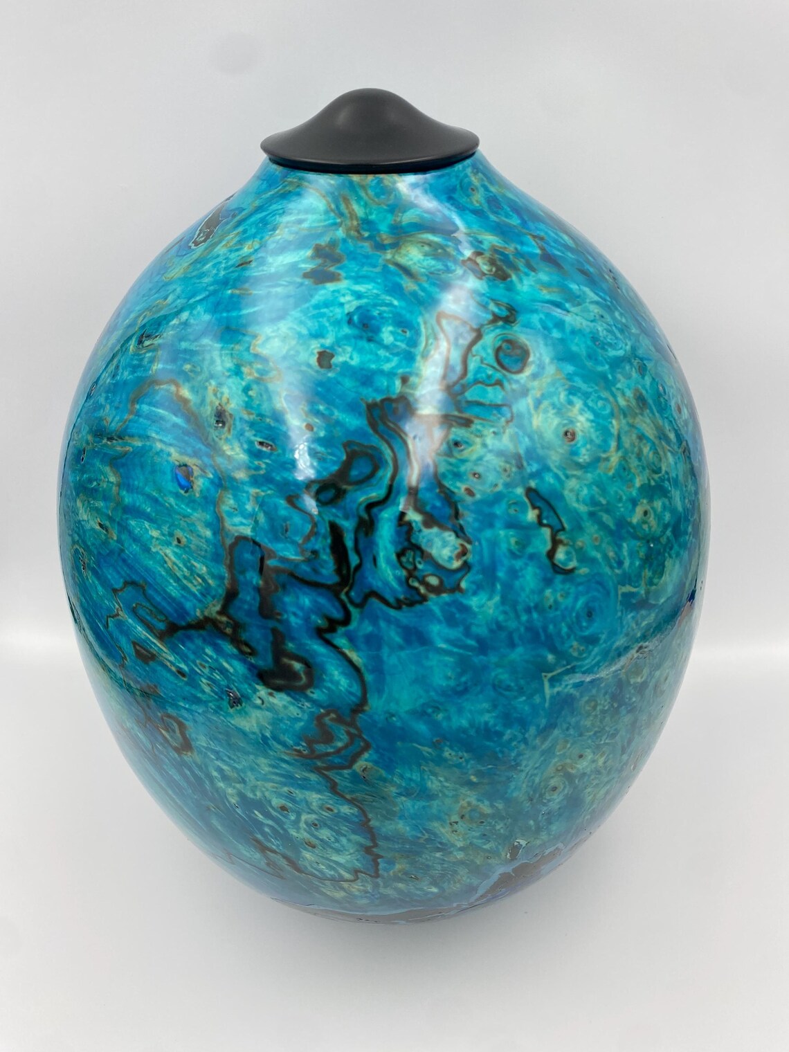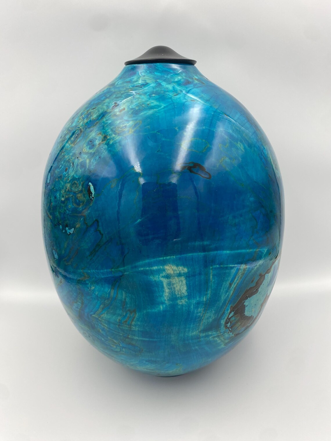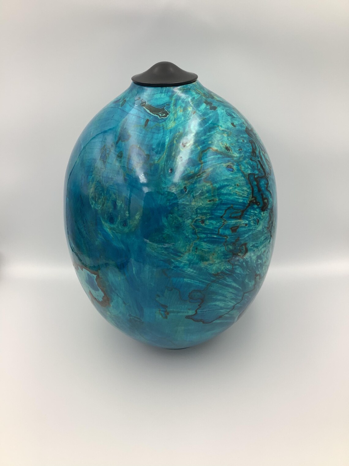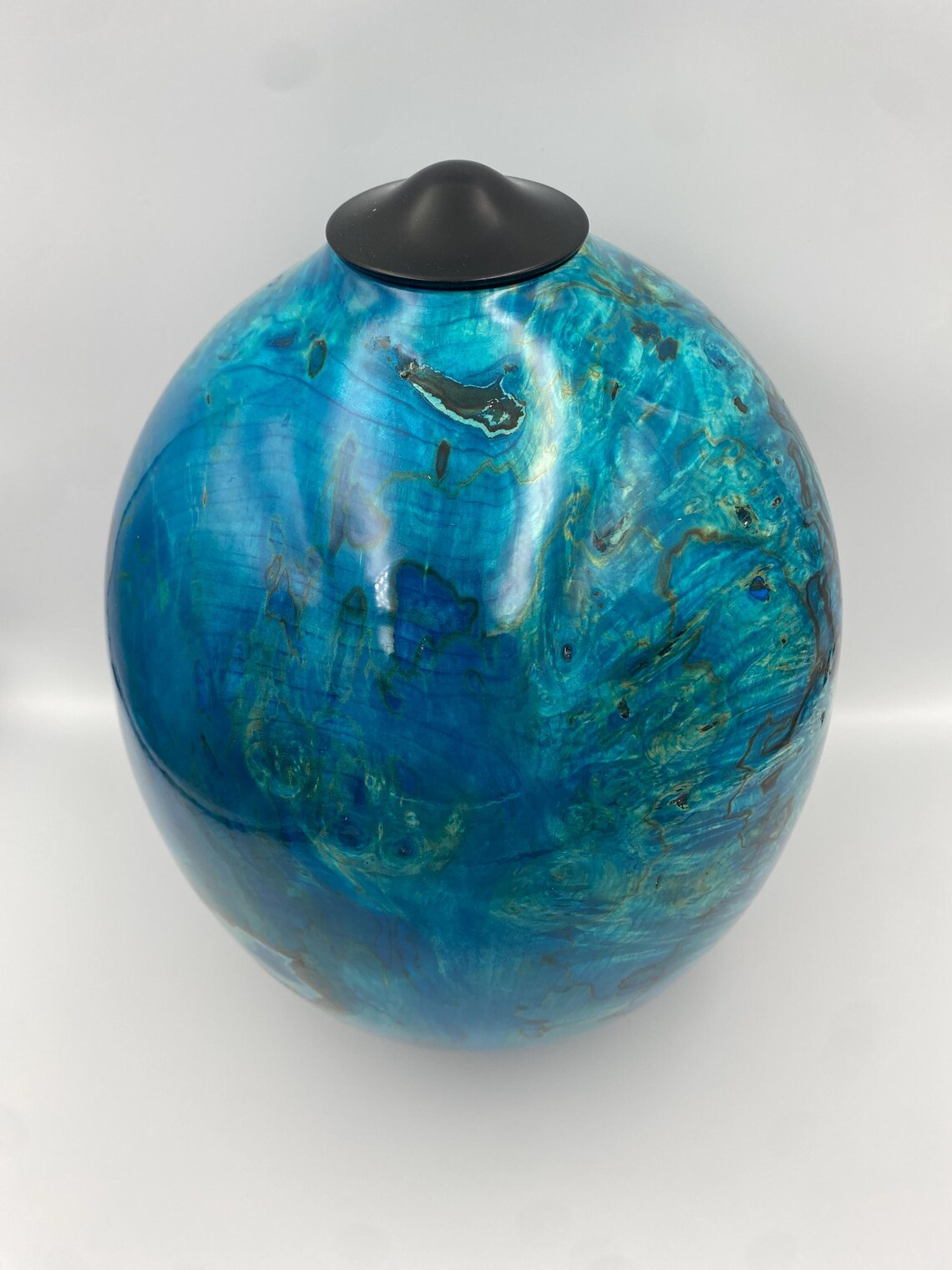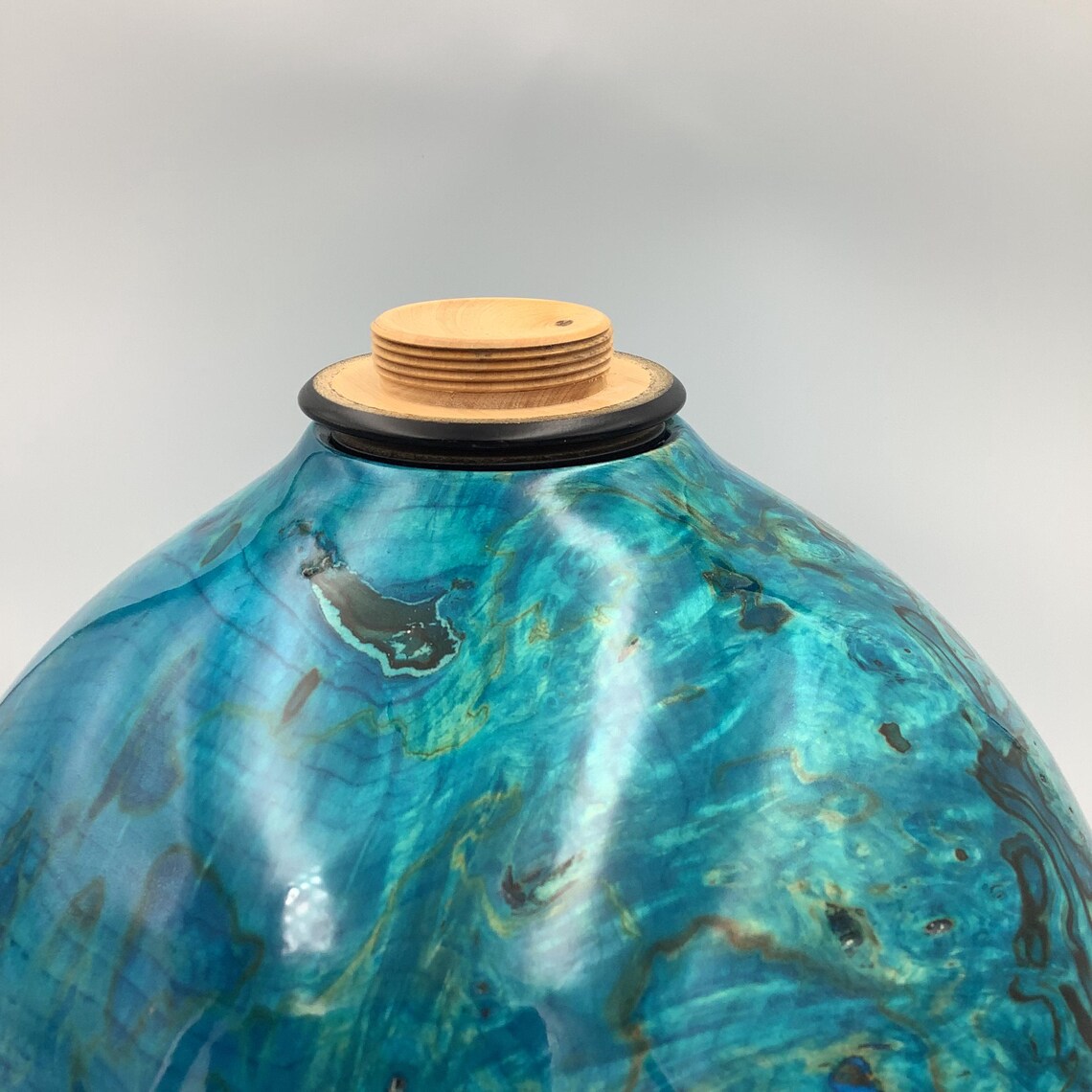 Oceanic Blue Handmade Wooden Urn in Rippled Sycamore Urn with Ebony Lid.