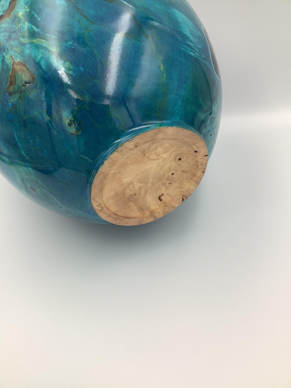 Materials: Wooden, Burr, Horse chestnut, Ebony wood, Royal blue stain, Hand cut threaded lid