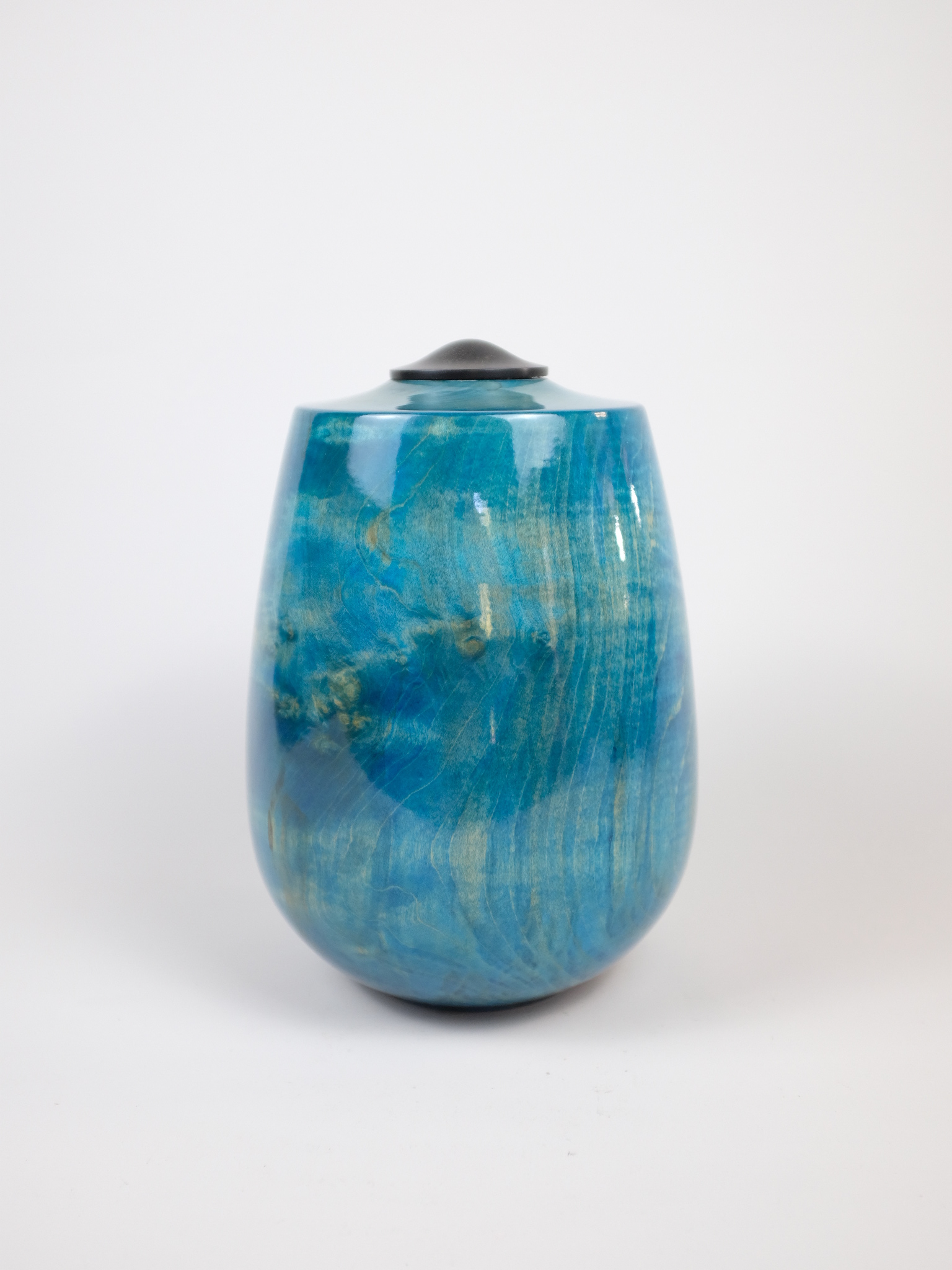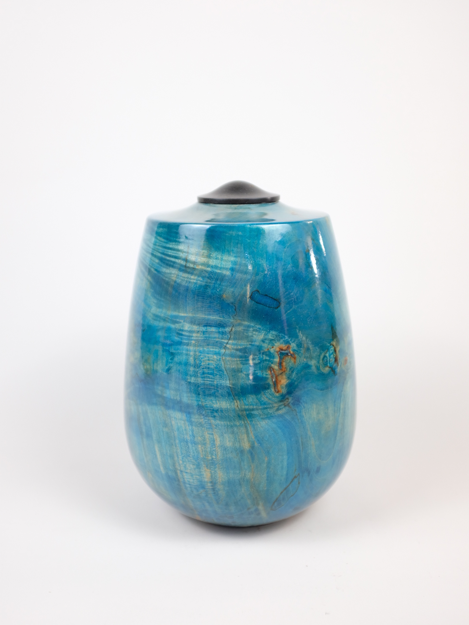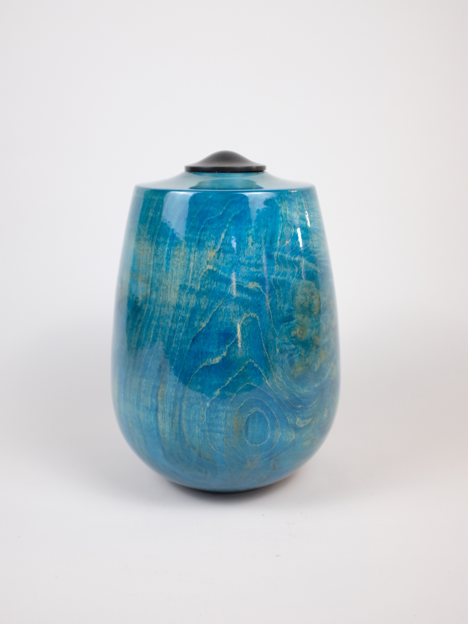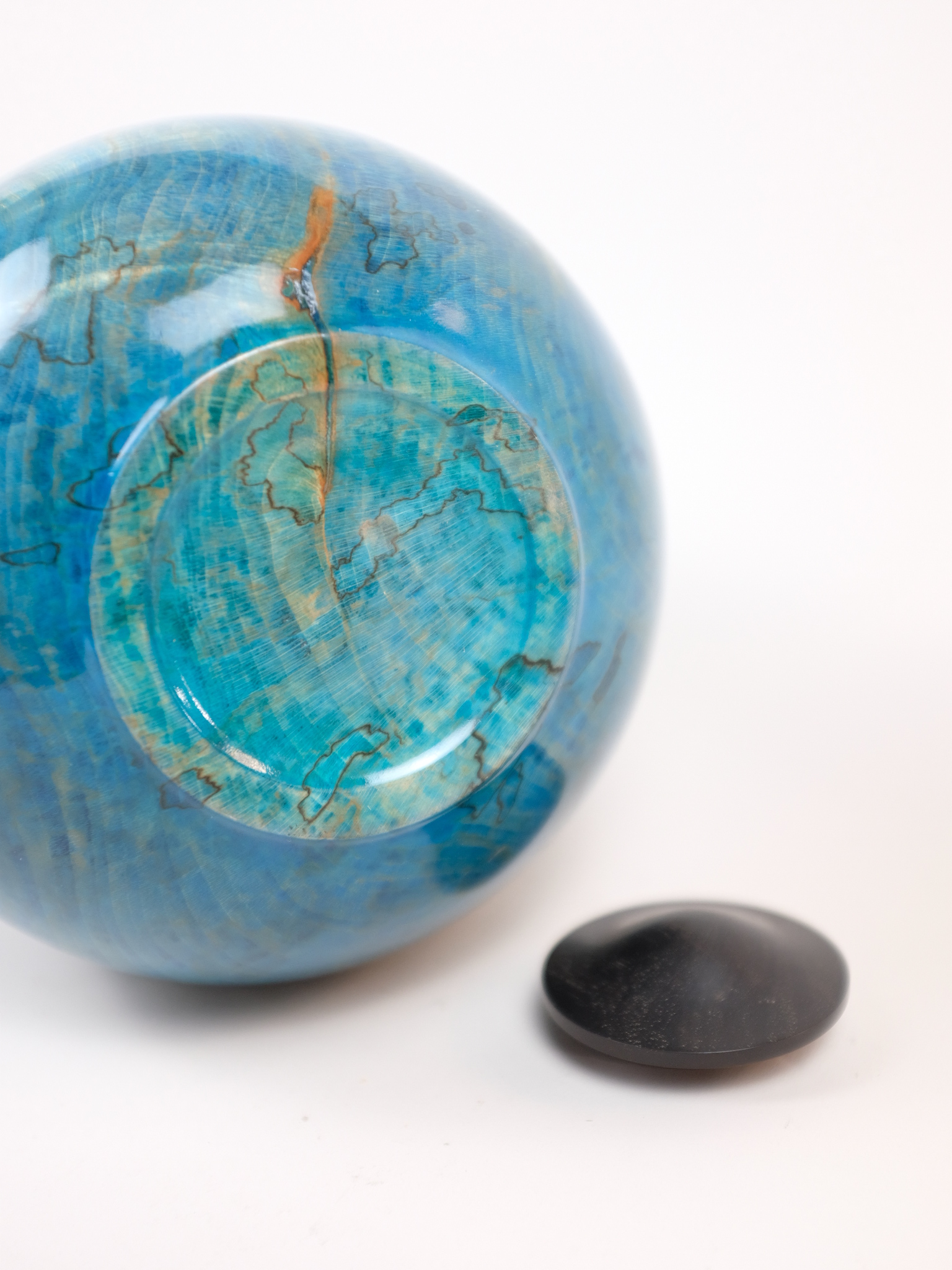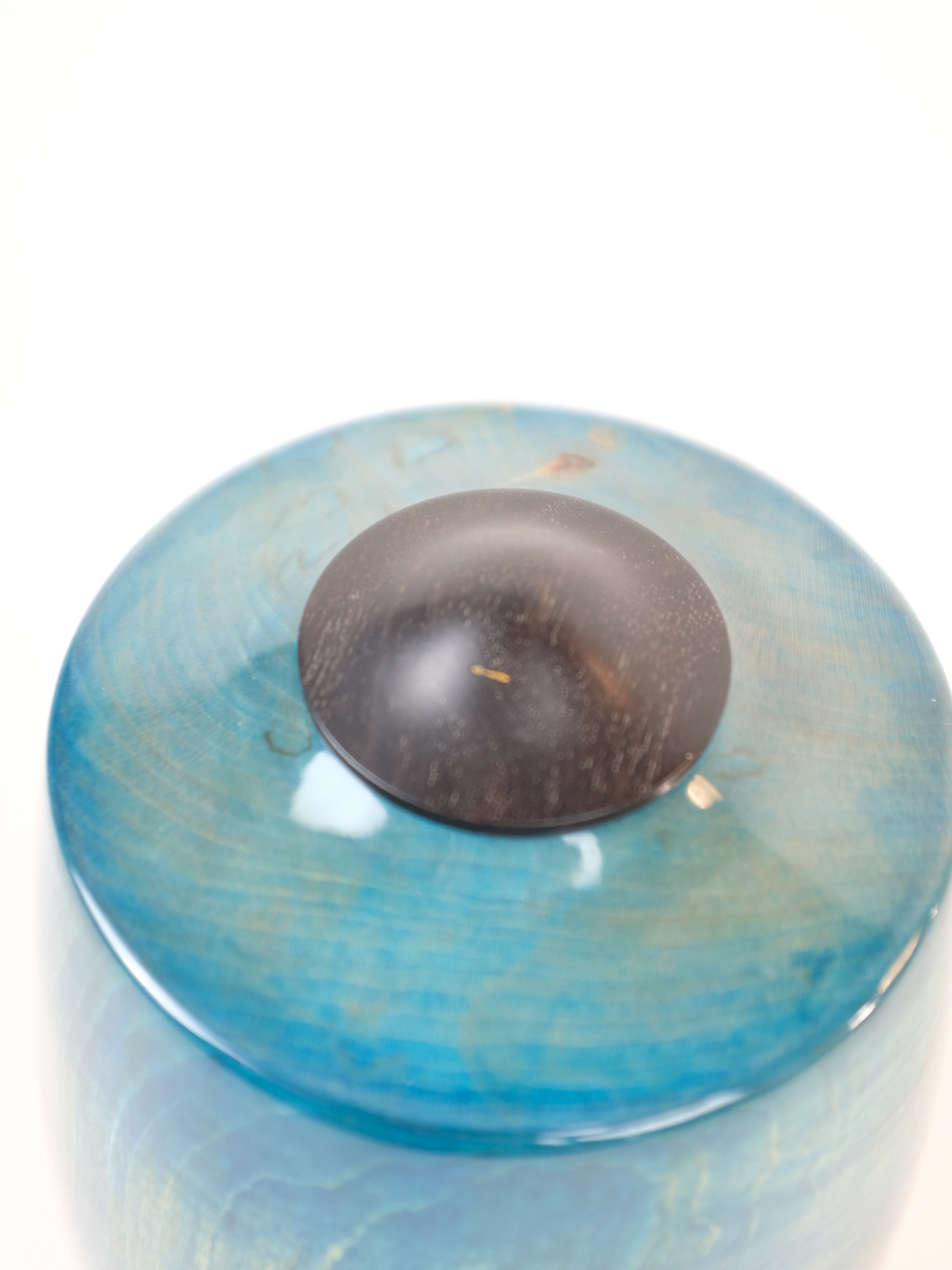 Materials: Sycamore wood, Ebony wood, Natural wood gloss finish, Natural blue wood stain, Hand cut threaded lid.